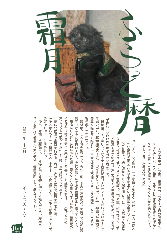 題材は、これまでの動物から、今年「私」を表す左手にペンを持って右足に装具をつけた少女を描いている。少女の傍らには必ず動物が寄り添ってくれる。
