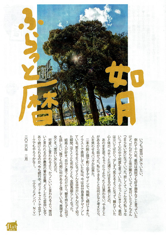 (「ふらっと暦」は、利用者の方々の毎日を写真と文章でふりかえる施設内広報誌で、題字は利用者の方の自筆です。表紙のみHPに掲載しています。)