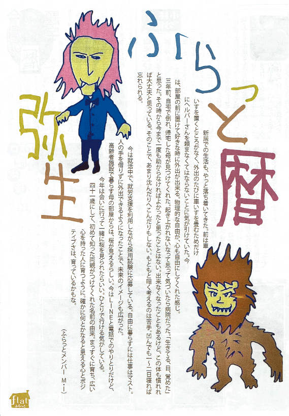 (「ふらっと暦」は、利用者の方々の毎日を写真と文章でふりかえる施設内広報誌で、題字は利用者の方の自筆です。表紙のみHPに掲載しています。)
