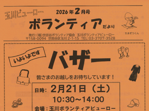 皆様のお越しをお待ちしています! 日時: 2月21日 (土) 10:30~14:00 会場: 玉川ボランティアビューロー 徒歩でのご来場に…